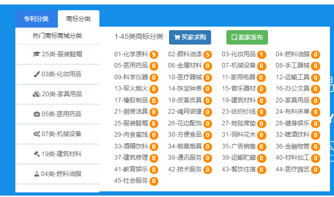 3.您也可以直接進(jìn)入專利商城或者商標(biāo)商城,直接在商城里通過關(guān)鍵字搜索,或者通過類別查找,亦或者直接瀏覽平臺推薦,找到合適自己的專利商標(biāo);