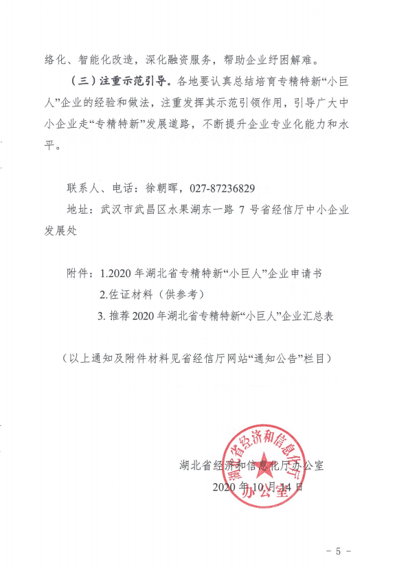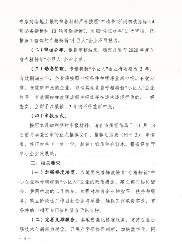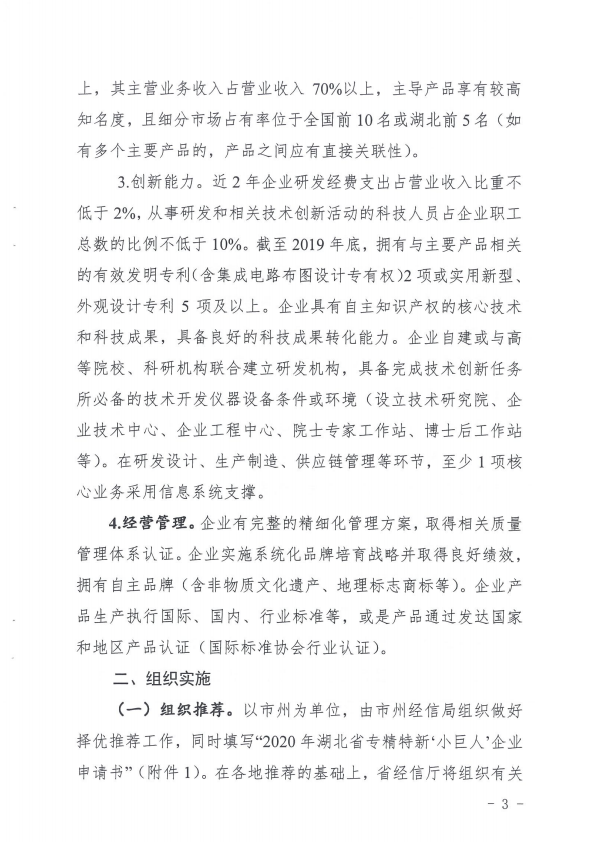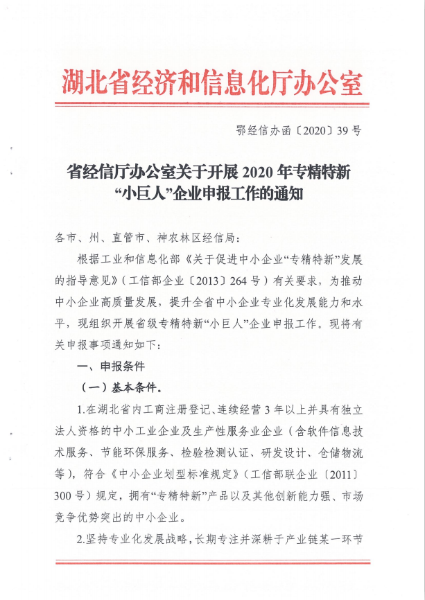 關于組織申報2020年湖北省專精特新“小巨人”企業的通知